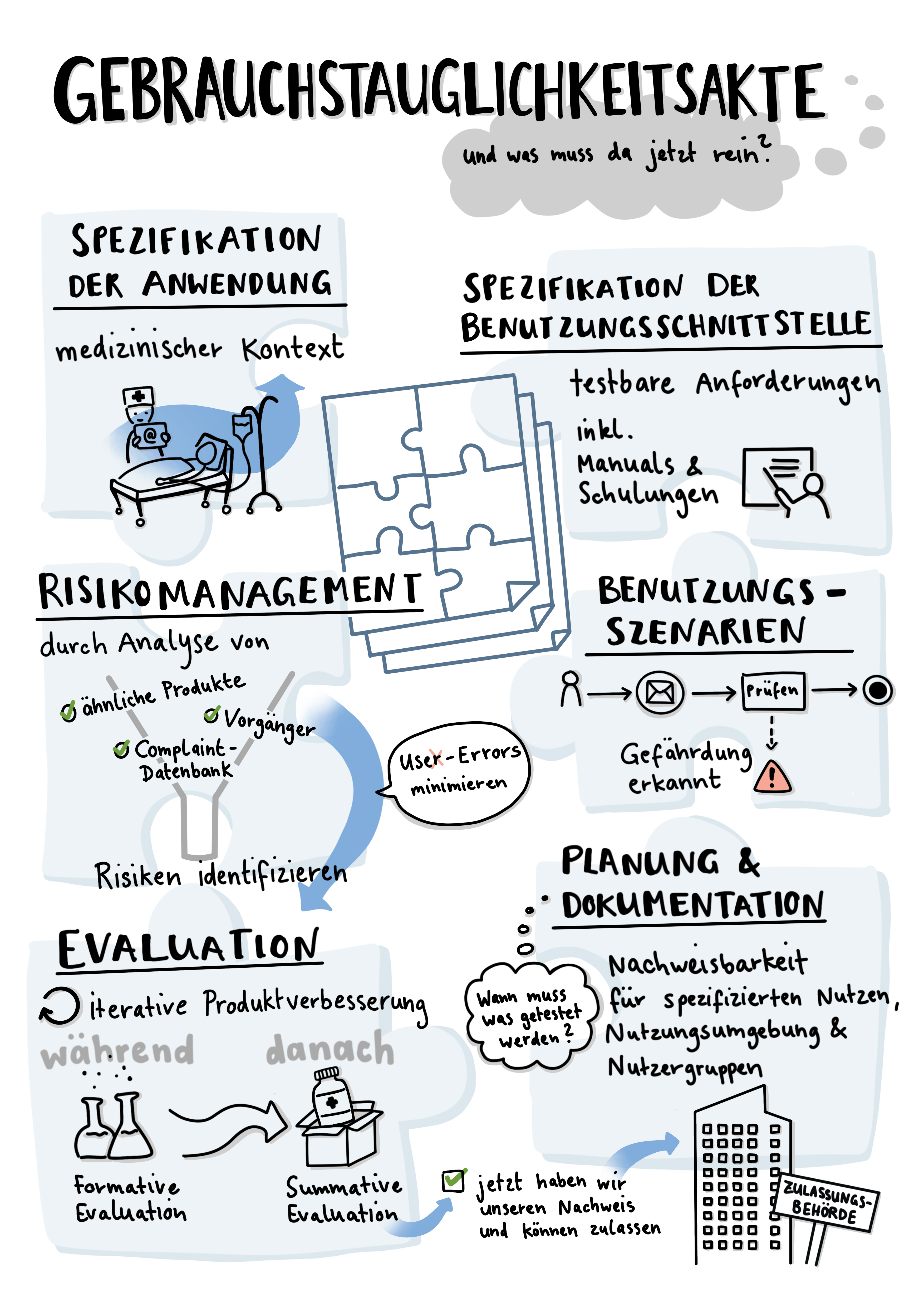 Sie umfasst alle Nachweise, die aus regulatorischer Sicht (IEC 62366 und MDR) im Hinblick auf die Zertifizierung eures Medizinproduktes oder eurer digitalen Gesundheitsanwendung (DiGA) notwendig sind. Wir haben Euch alle Anforderungen in einem Poster zusammengestellt.